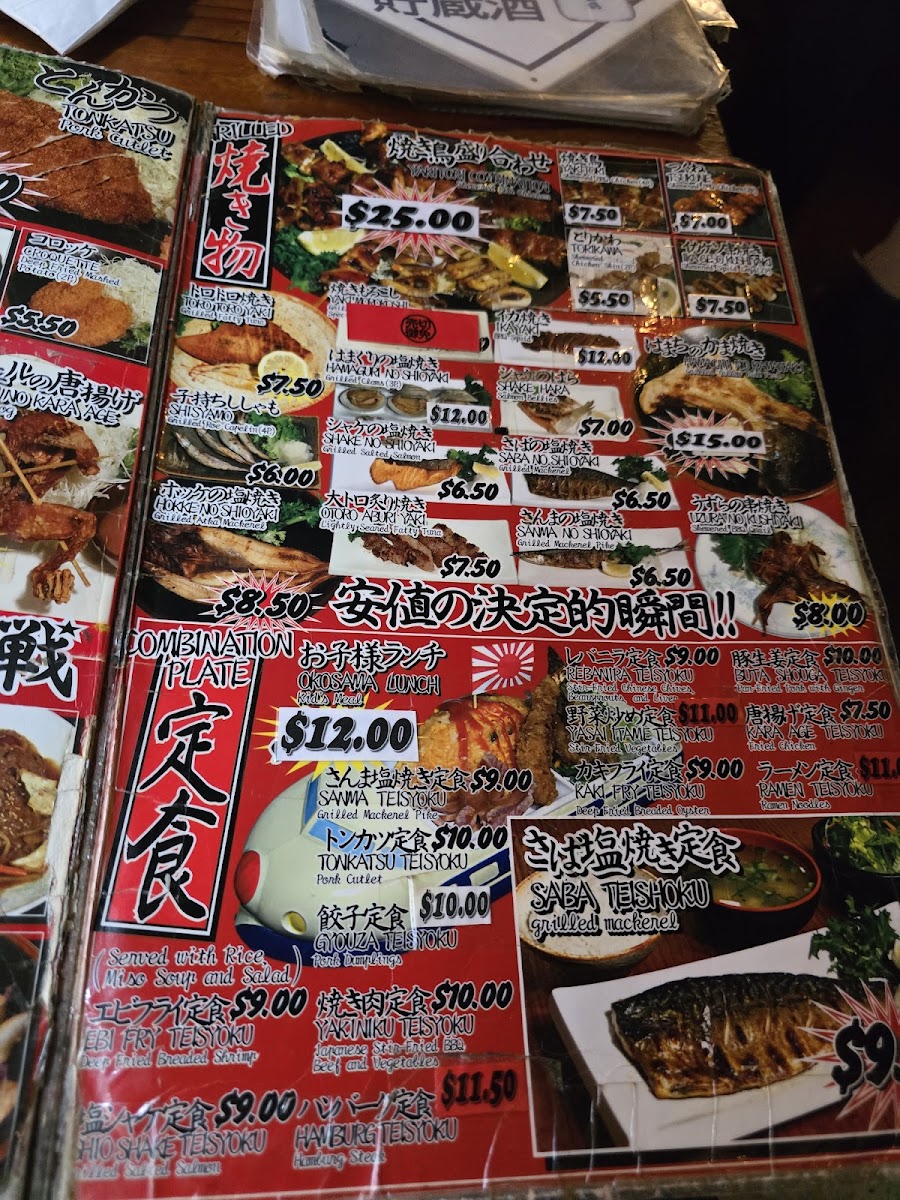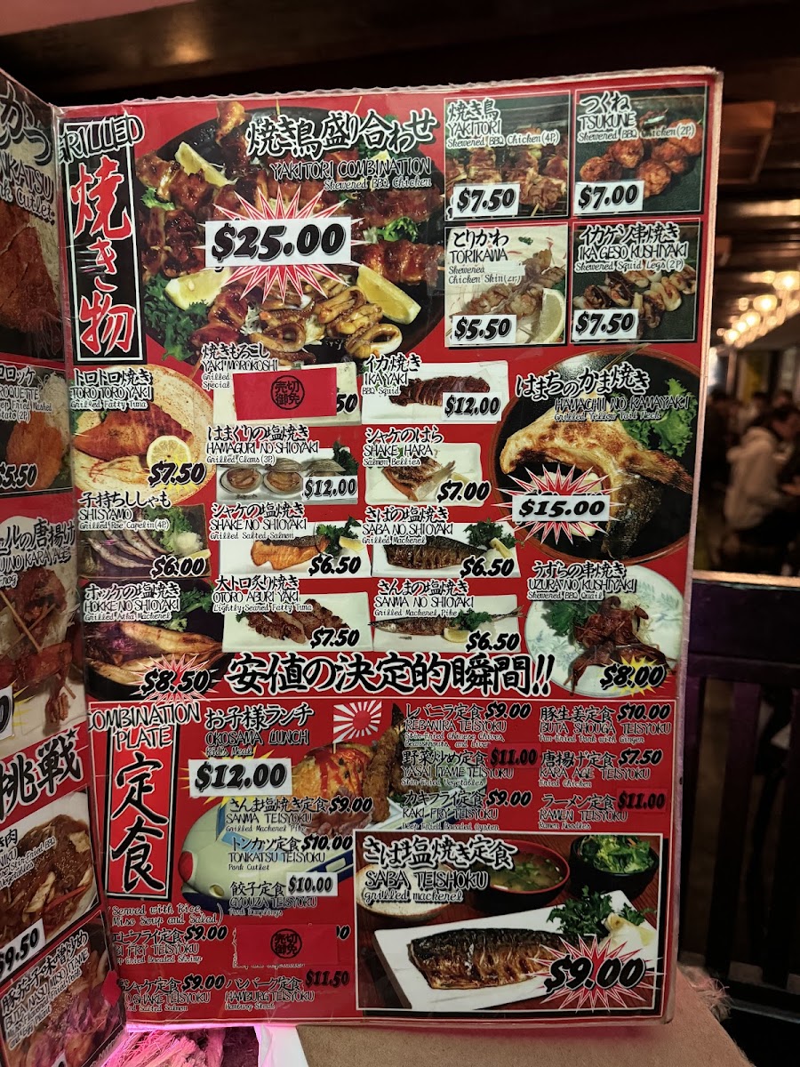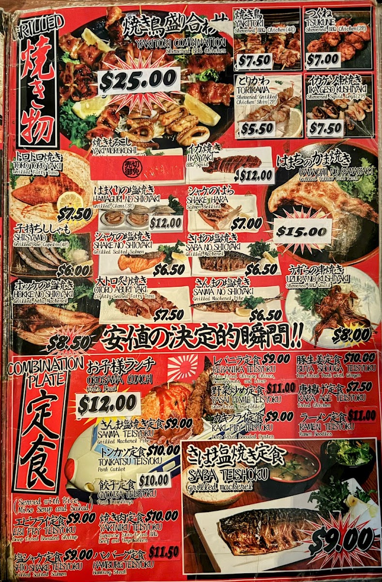 The menu showcases a variety of grilled options like Saba No Shioyaki (grilled mackerel) and Yakitori (skewered chicken), all at wallet-friendly prices. Perfect for sharing, the ochazuke bowls provide a comforting, flavorful experience with options ranging from salmon to plum.